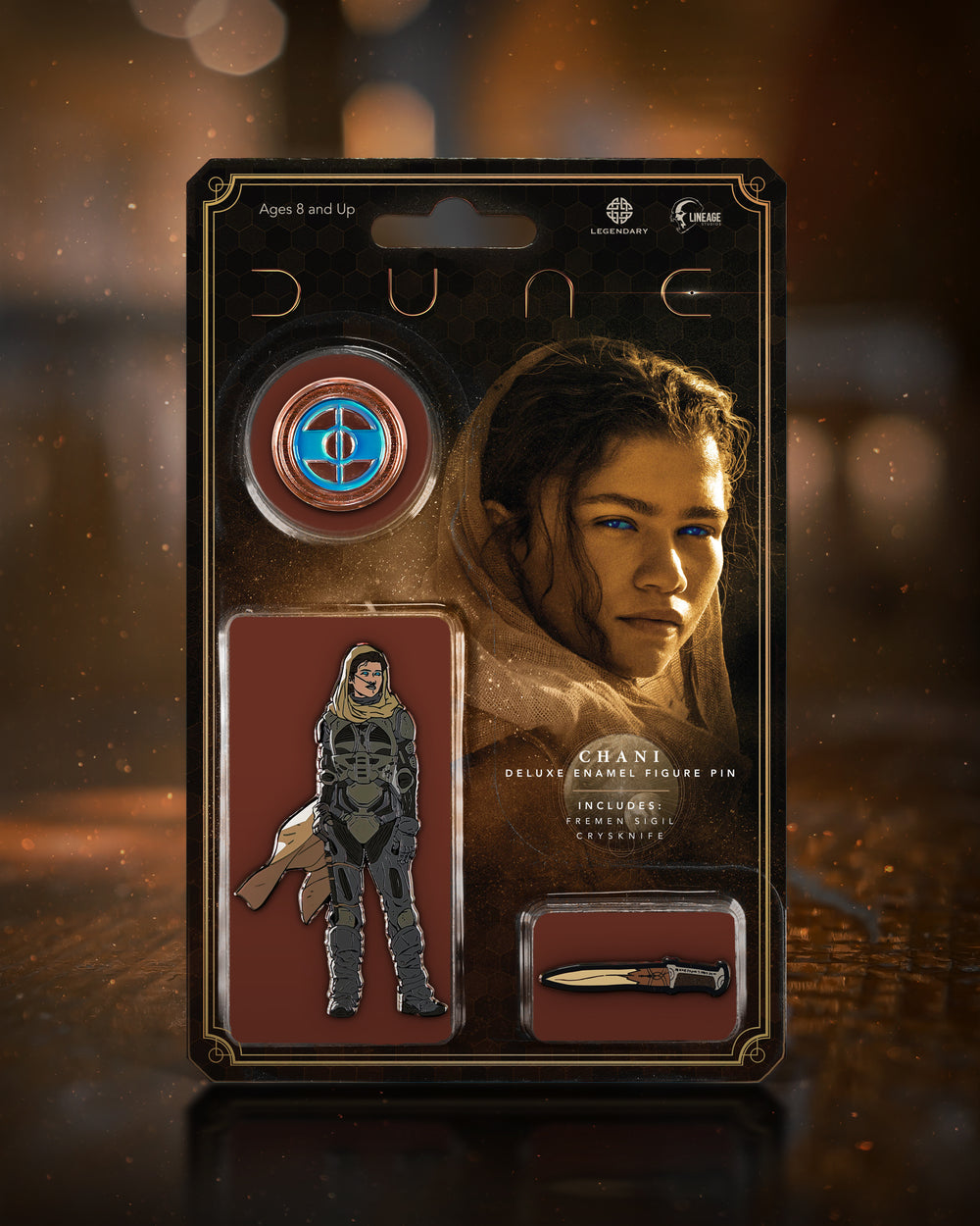 Our DUNE Deluxe Enamel Pin Sets include 3 unique offerings. Equipped with a Crysknife and the Fremen Sigil, Chani measures 2.85" tall and is incredibly detailed. Rock the Fremen warrior on your jacket, backpack or hat and make a statement.