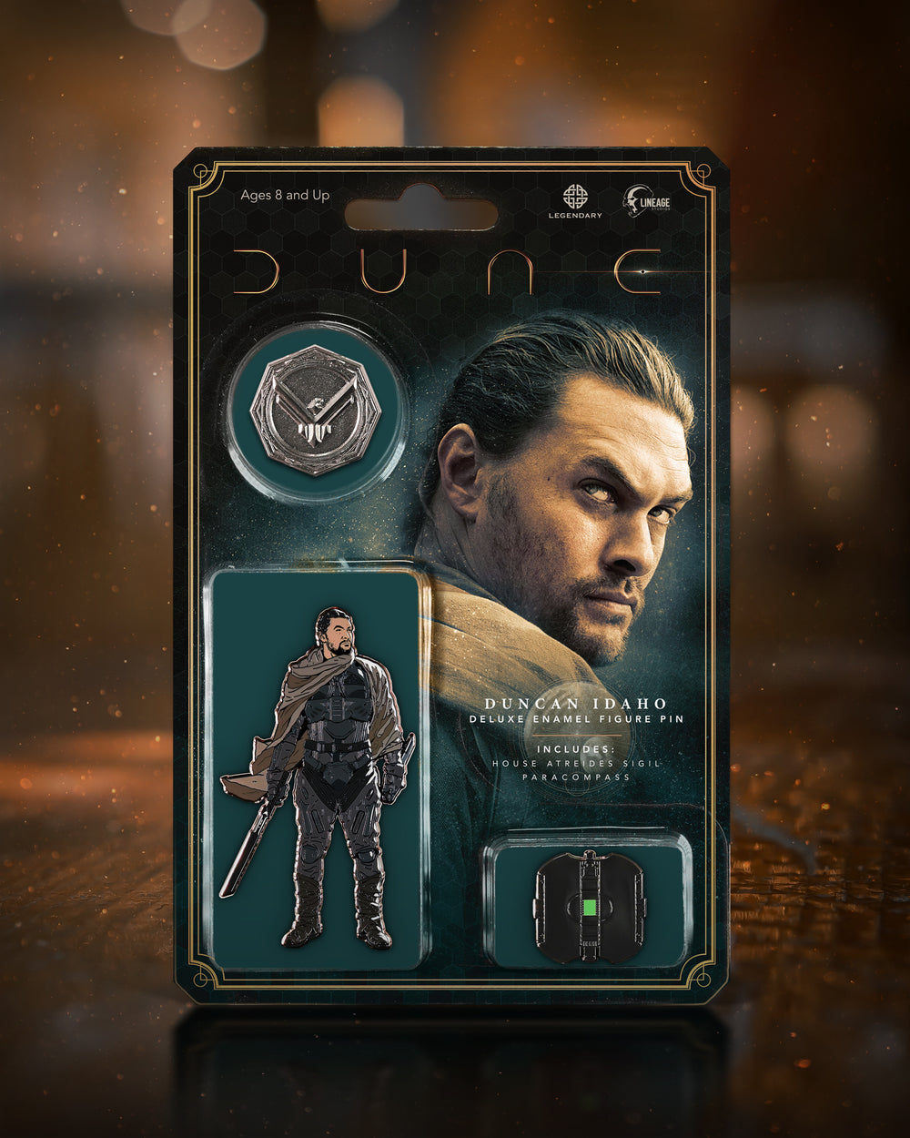 Our DUNE Deluxe Enamel Pin Sets include 3 unique offerings. Equipped with a Paracompass and the House Atreides Sigil, Duncan measures 3" tall and is incredibly detailed. Rock the "Swordmaster" on your jacket, backpack or hat and make a statement.